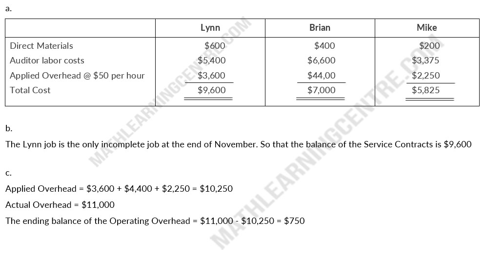 Overhead costs are applied to jobs on the basis of auditor hours, and the predeterminer overhead rate is $5 per auditor hour. The Lyn job is the only incomplete job at the end of November. Actual overhead for the month was $11,000.